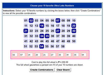 Each of the five in the pool pick two numbers, giving you a total of ten numbers. But wait... there are only six numbers in the Ultra Lotto. What do we do with ten numbers?
