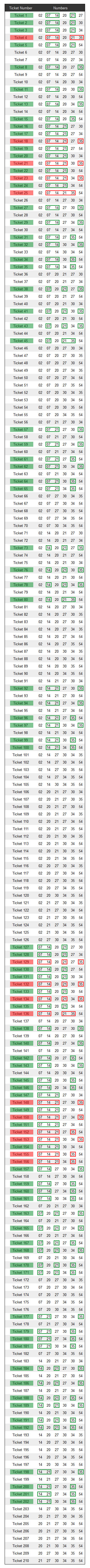 The image below shows you all 210 of the tickets you purchased. Green tickets are 3 number wins for Php 20.00 each... and the red tickets are 4 number wins for Php 3,800.00 each.